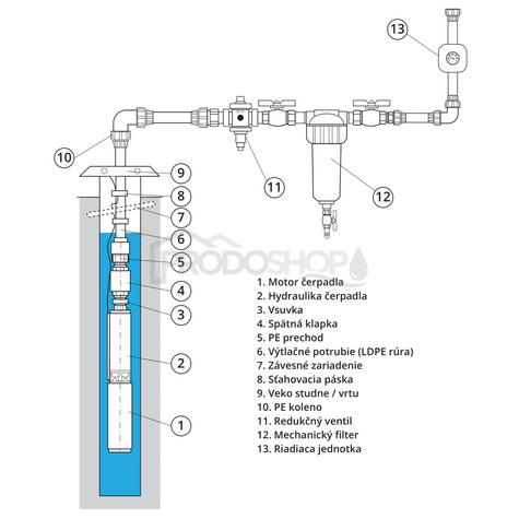 Dacă apa din puț nu este complet curată, recomandăm instalarea unui filtru de impurități mecanice în rețeaua de apă (imaginea 12). - Unitatea de control este întotdeauna amplasată înaintea primului punct de consum (13).